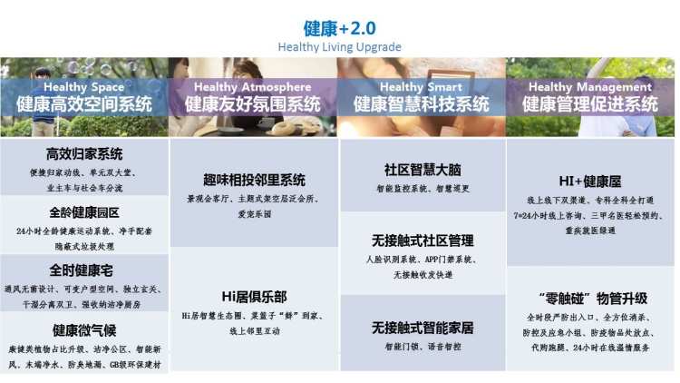 海伦堡的“健康+2.0”已形成十大健康生活体验标准,涉及高效归家系统、全龄健康园区、全时健康宅、健康微气候、HI+健康屋、社区智慧大脑、无接触式社区管理等,共有48个价值点、169项细节。
