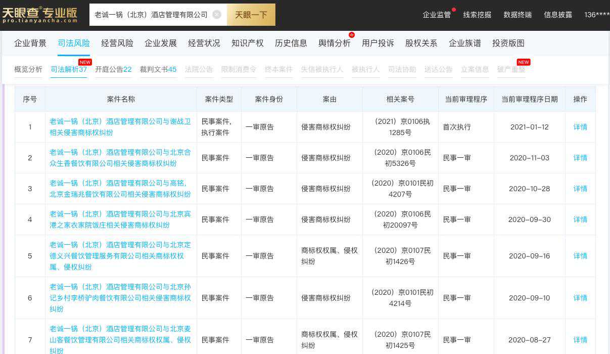 这并不是老诚一锅公司首次起诉使用与其品牌名称和商标相似的企业和法人。据不完全统计,天眼查相关记录显示,从2019年4月18月至今,老诚一锅公司作为原告起诉的案件信息高达30条,案由涉及商标侵权纠纷等。老诚一锅总部法务相关负责人范先生告诉新京报记者,“近3个月起诉已立案的已经有40多件。”