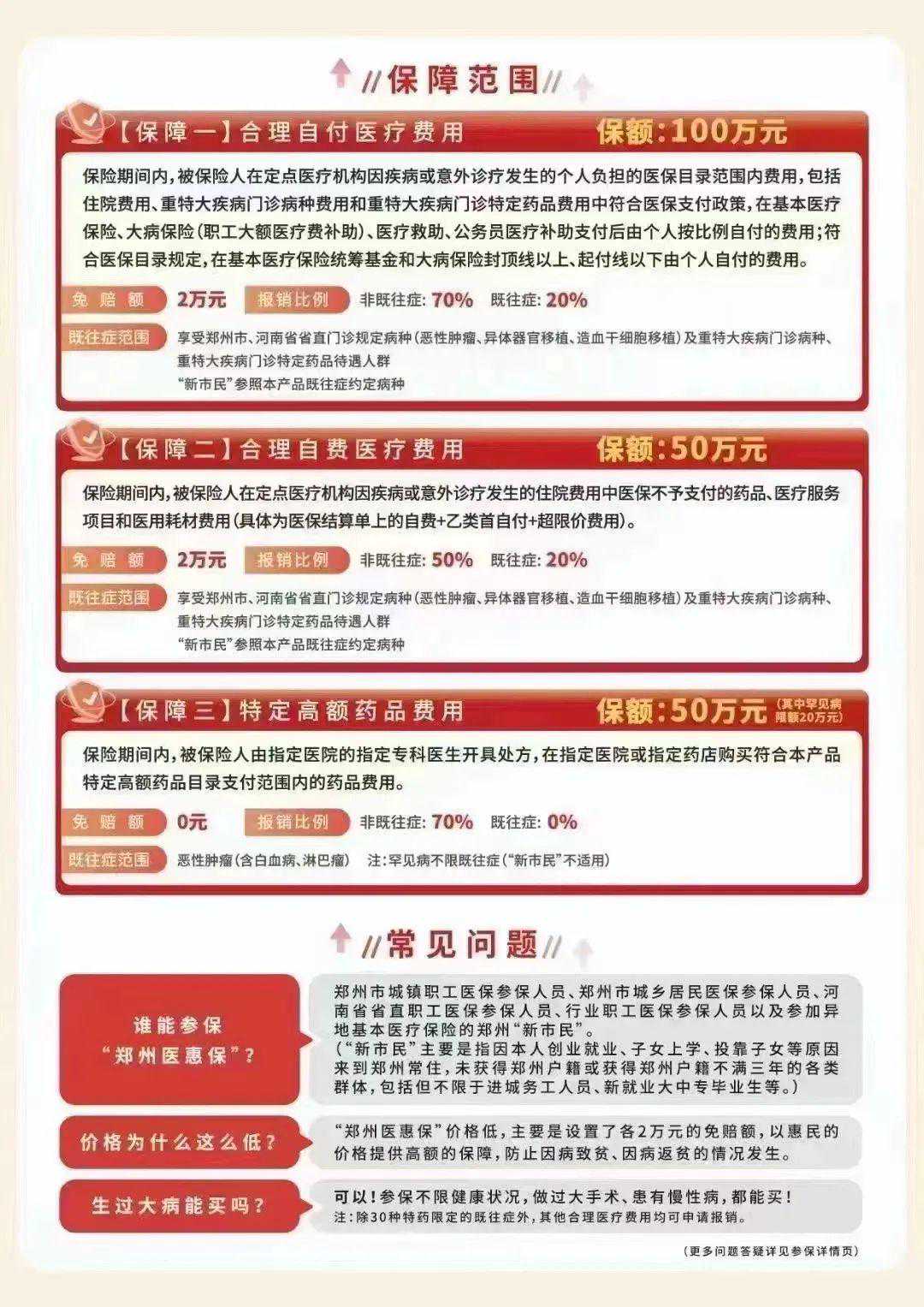 “郑州医惠保”包含三重保障:合理自付医疗费用保障、合理自费医疗费用保障、30种特定高额药品费用保障。