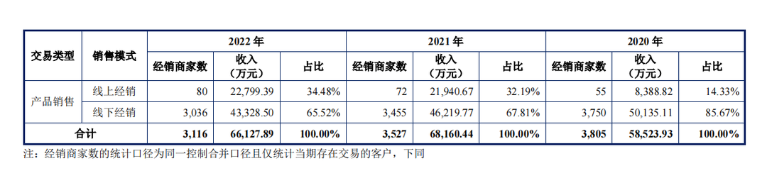 招股书显示,及至2022年,线下经销商家数量在品胜的销售模式占比中仍然超过60%,为3036家。