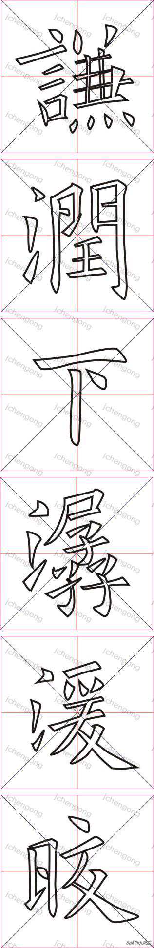 继续临写九成宫“谦润下潺湲皎”。其中,“润下”两字前面已出现过,书友们可看前面的内容。谦:1、注意横向笔画间距要均匀。2、上面三点本应均匀排列(如“祥”),因下面两个竖画要穿插在里面,故将三点间距进行......