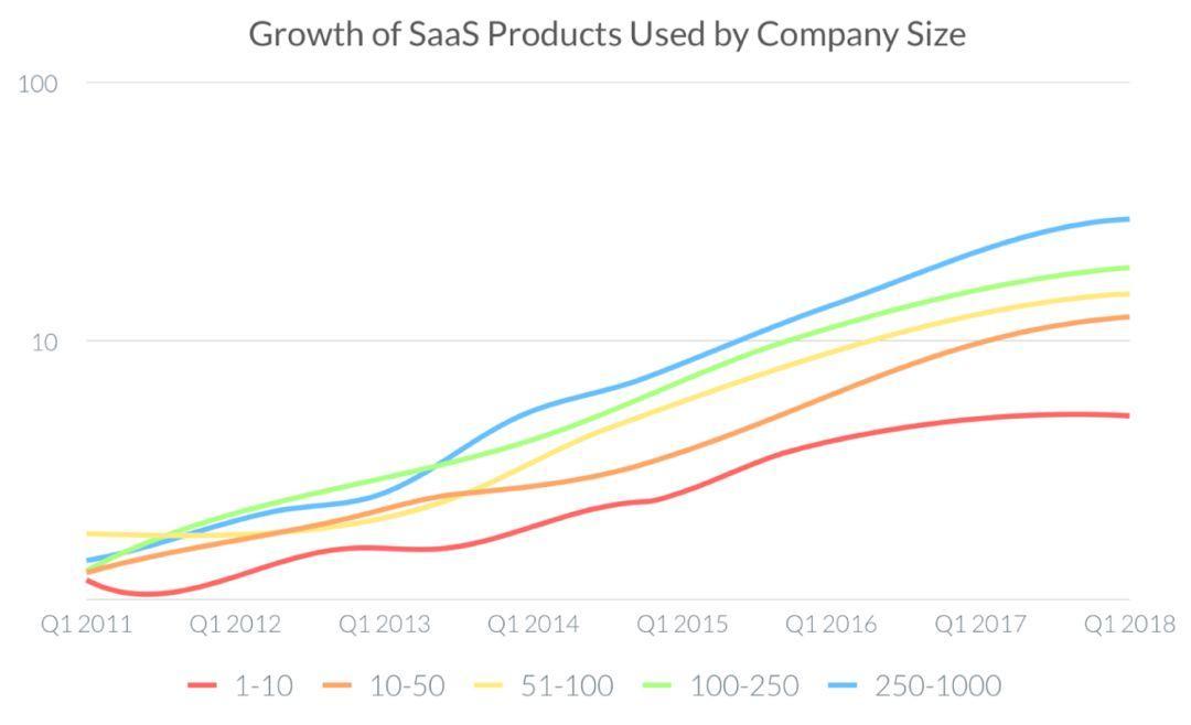 横轴表示为公司规模(以员工数量单位);纵轴表示为SaaS产品的使用量