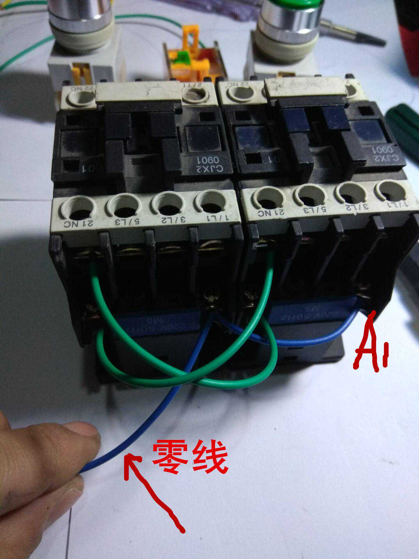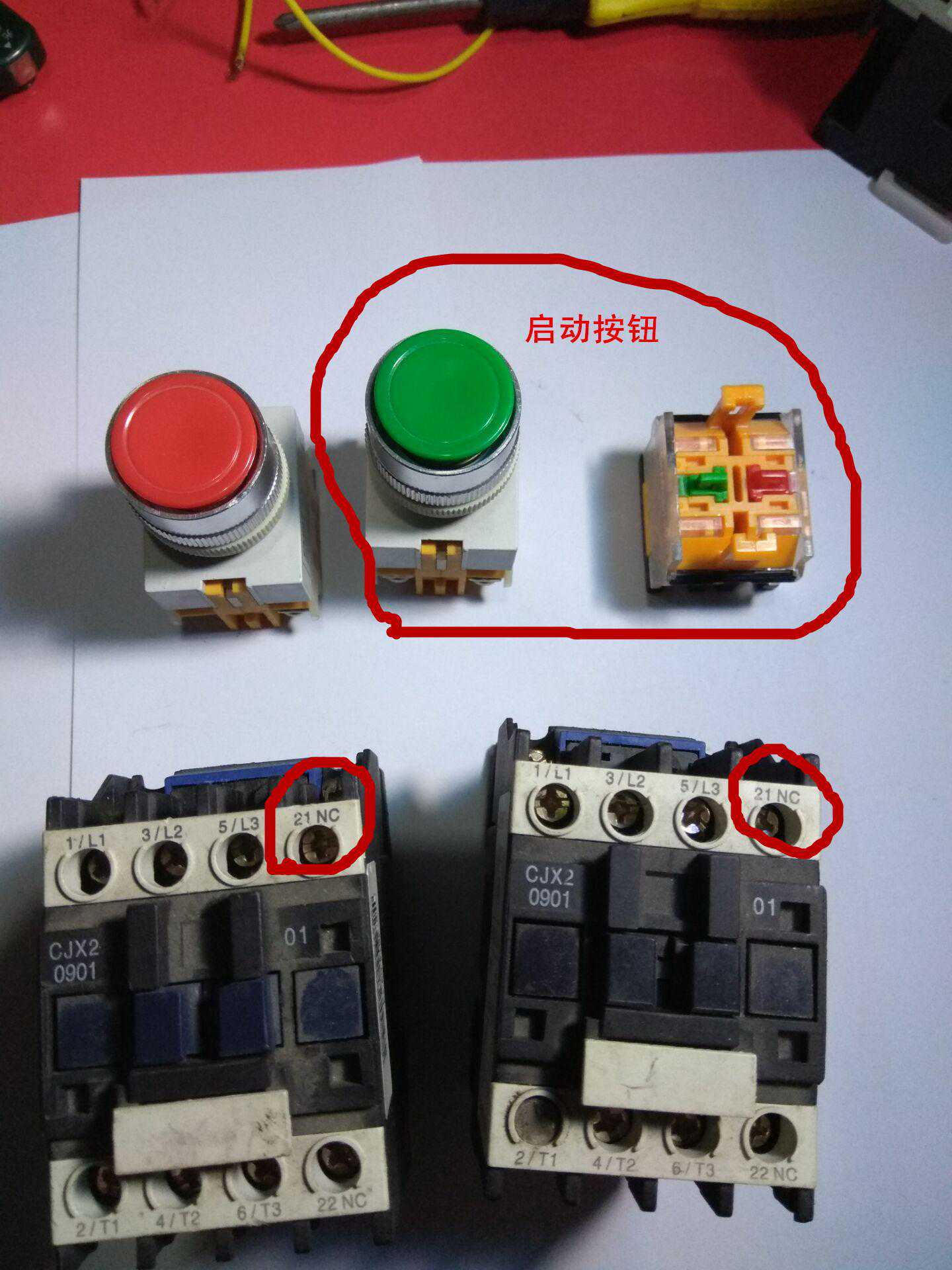 为了方便大家看清楚接线,我把其中的一个启动按钮的上帽去掉了,可以直接看到端子的接线,两个启动按钮的接线是一样的。三个按钮都是复位按钮,两个接触器上必须一组常闭NC辅助触点。