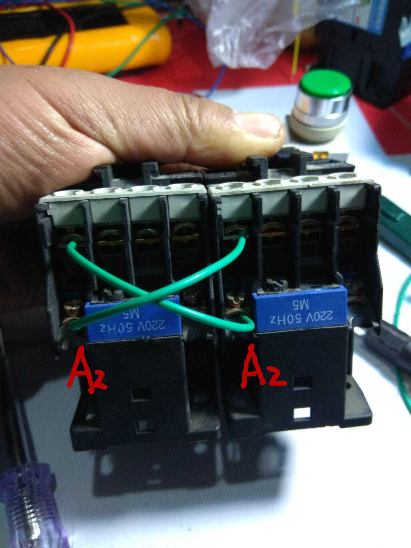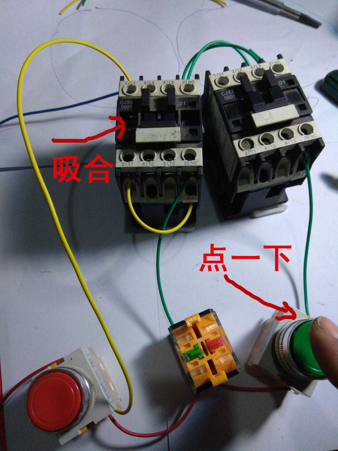 两个接触器各接一个启动按钮,启动都是连接按钮开关的绿色一端,也就是常开触点。
