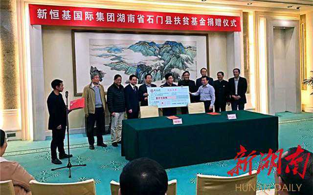 新湖南客户端11月7(记者周勇军通讯员戴文李飞)为助推石门县脱贫攻坚,香港新恒基国际(集团)有限公司设立专项扶贫基金,捐赠1000万元,用于石门县境内救灾、济困、扶老、助孤、助医、助残及其他社会公益事业。11月4日,香港新恒基国际(集团)有限公司与石门县慈善总会在北京举行签约仪式,中华慈善总会、港澳台侨联络局、中冶集团、泉林集团、华融集团等相关负责人见证签约仪式。
