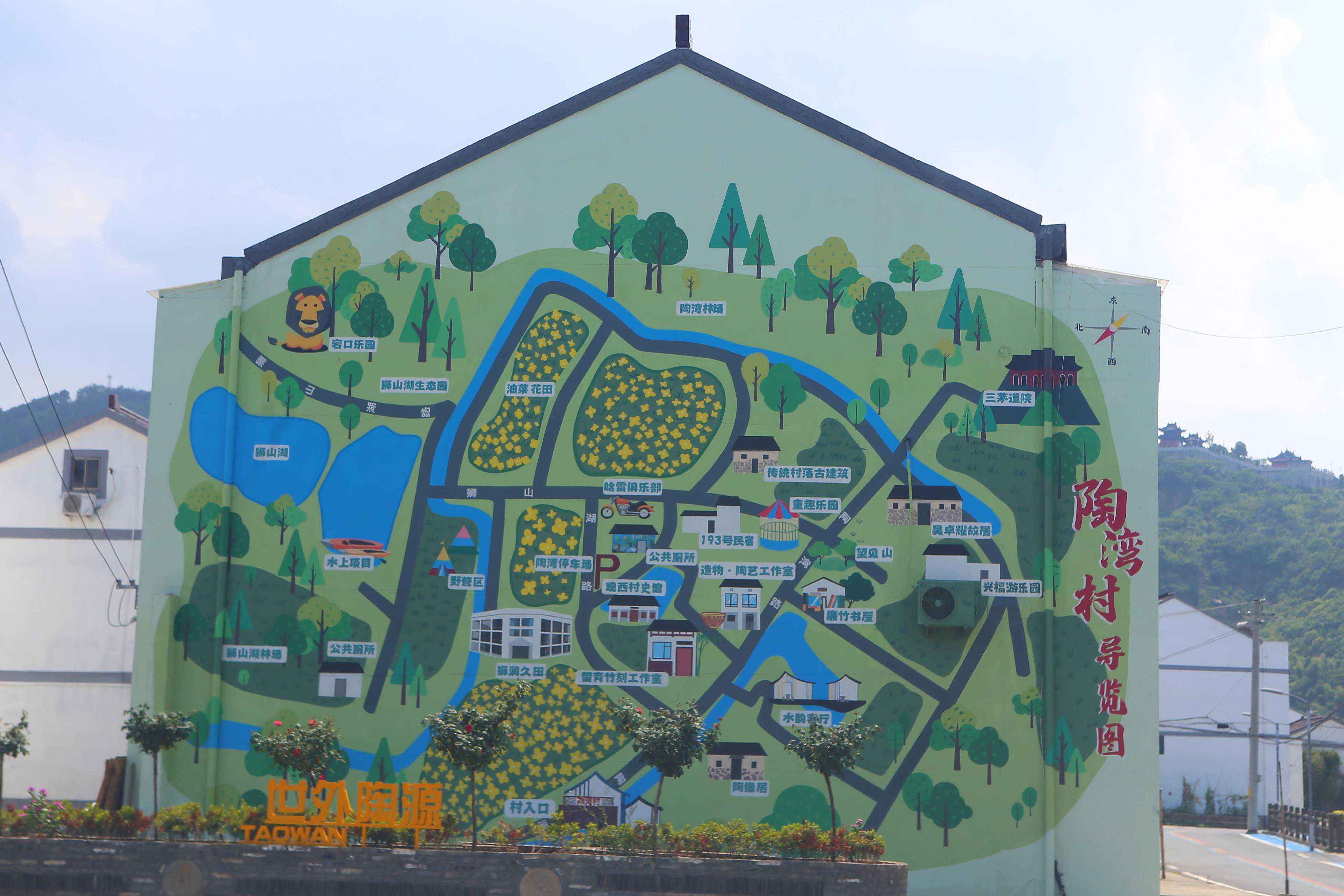 秦望山三茅道院顺着导航的指引,来到秦望山北麓的陶湾村。陶湾村的村口,在山墙上绘制了巨幅旅游导览图,比较感兴趣的有三茅道院、狮山湖生态园和吴卓耀故居。桃湾村是一个自然村,隶属南闸街道观西村,2022年9月被评为江阴最美乡村。