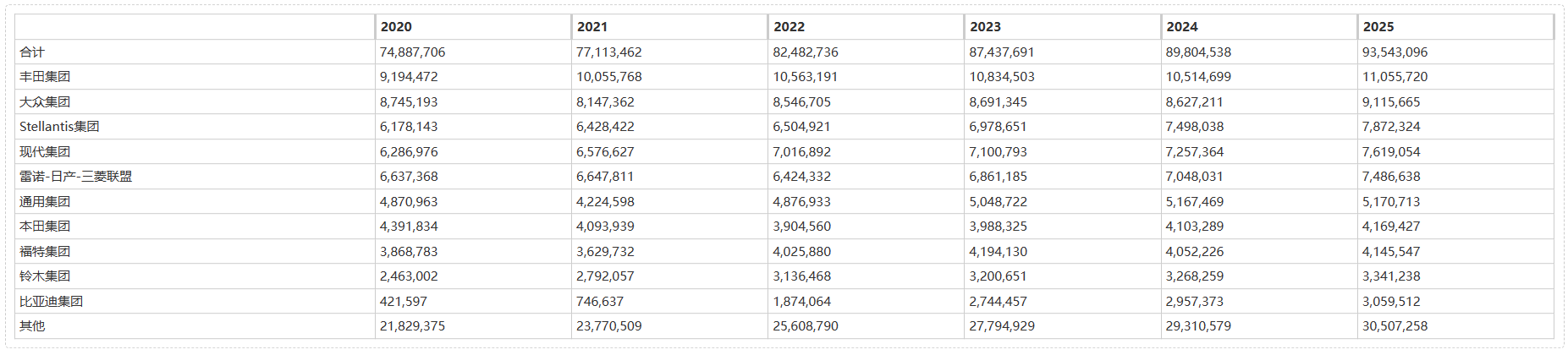各集团全球轻型车产量预测(前十名)