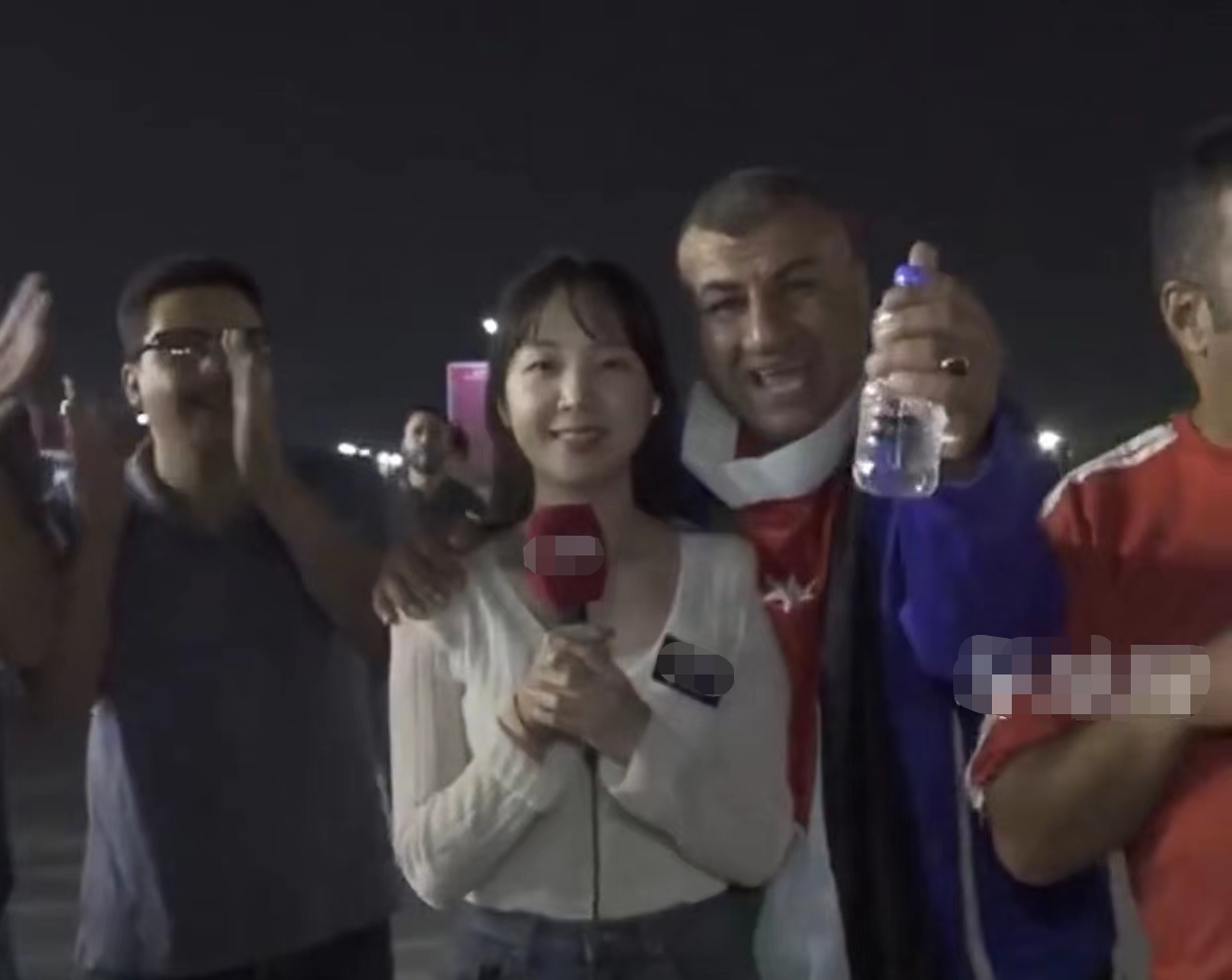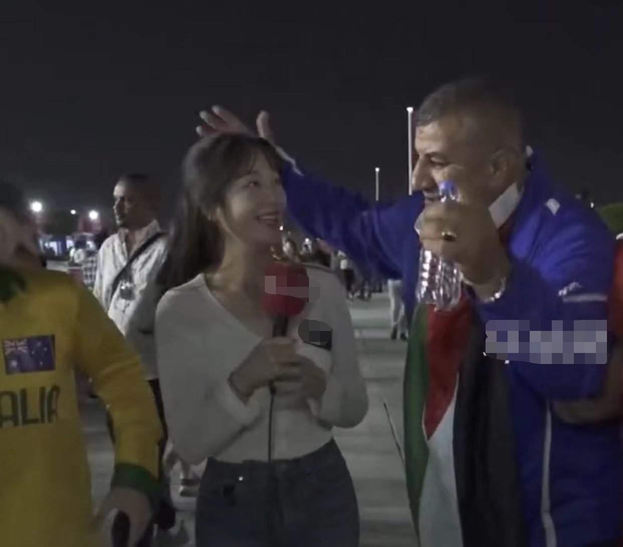 只是,没想到的是其中一名身材高大,脖子上挂着约旦国旗的男性球迷,直接强行搂住主持人的肩膀,然后就开始手舞足蹈地跳舞。