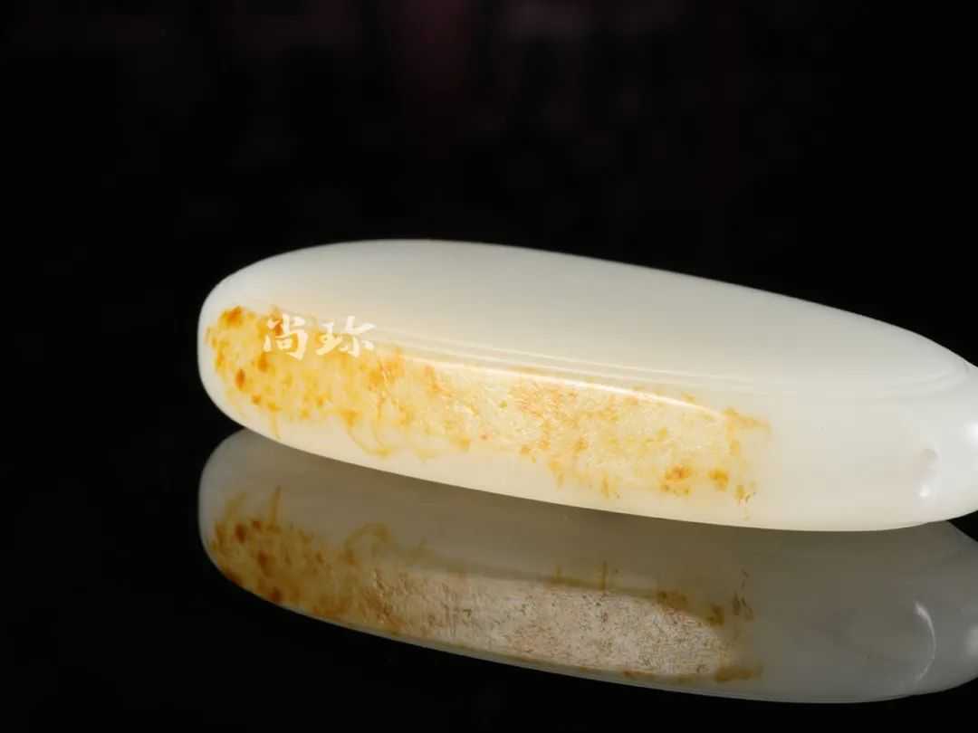 玉质感上佳,呈现上佳的油性润度和玉质感,留一片籽料天然洒金皮于玉牌一侧,炫丽璨艳,毛孔排列自然不规则。全件无脏无绺,触感柔和滋腻。
