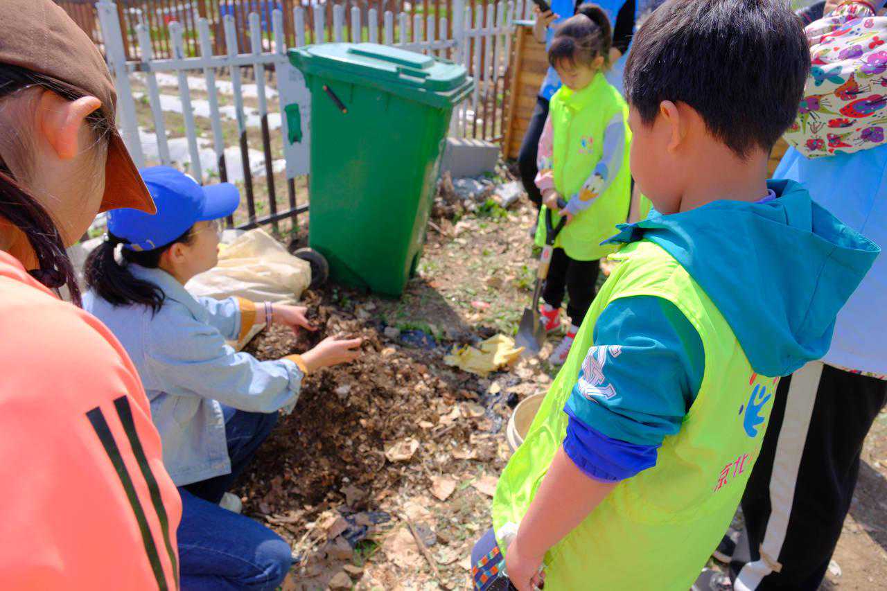 种植完毕后,大家将收集来的生厨余进行堆肥,小敏老师现场为孩子们科普三箱式堆肥和波卡西堆肥原理,并和大家重温了“垃圾分类-厨余堆肥-生态种植-家庭餐桌-厨余垃圾”生态闭环的运作模式。孩子们听得津津有味,举着直直的小手积极和老师一起温习互动,回应各种生态堆肥科普问题。