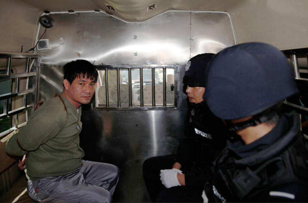 随后,老挝警方卸下了他的手铐、脚镣,将他移交给中国警方,八名全副武装的中国特警用安检器对他的全身进行了扫描,更换上了中国警方的脚镣手铐,押送回国。