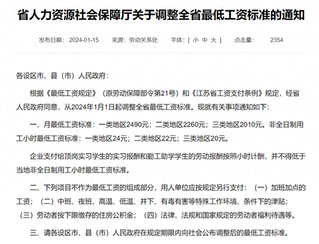 根据《最低工资规定》(原劳动保障部令第21号)和《江苏省工资支付条例》规定,经省人民政府同意,从2024年1月1日起调整全省最低工资标准。现就有关事项通知如下: