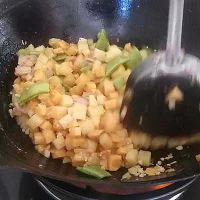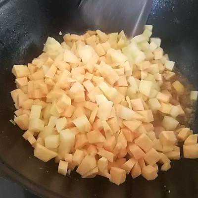 5、倒入土豆丁和红薯丁,翻炒一会儿