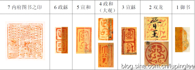宋徽宗广收天下书画珍玩,扩充翰林图画院,内府庋藏历代名迹,达到了前所未见的丰赡,并诏文臣编纂《宣和书谱》、《宣和画谱》与《宣和博古图》。宣和内府不仅荟萃天下之珍,宋乔年、米芾、蔡京、梁师成、蔡卞等倾力于内府所藏的书画保护和整理,重新装裱编成卷帙,宋徽宗亲自题写标签,分级入藏。从现有传世书画名迹获观鉴藏印记有:1.“御书”葫芦形印一枚;2.“双龙”圆形印一枚;3.“宣龢”连珠印一枚;4.“政和”长方形印一枚;5.“宣和”长方形印一枚;6.“政龢”连珠印一枚;7.“内府图书之印”九叠文大方印一枚;8.“双龙”方形印一枚;9.“宣和中秘”长圆形印一枚;10.“御书”长方印一枚;11.“御书之宝”印;12.“大观”印;13.“重和”印。而前七方印近代称“宣和七玺”,特指“宣和装”手卷上恒定钤盖七枚鉴藏印,印文只在钤“政和”印处偶尔调换“大观”、“重和”、“双龙”印,而钤印位置不变。有荒谬者提出“宣和十几玺”说法,殊不知不能以用印多寡曲解“宣和七玺”之义。