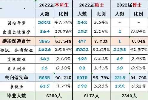 总的来说,印象比较深的就是升学率了,高达66%左右的学生继续深造,一部分在国内高校深造,一部分出国。而在就业数据层面,浙江大学2023年就没有很明确的数据,只知道有22%左右毕业的学生去就业了,不过小义还是附上了2022年的具体情况,大家可以当一个参考。