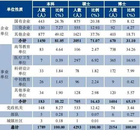 在就业单位的选择上,浙江大学的学生,无论是本科生,硕士生,还是博士生,其实都不太热衷于私企。本科生去私企的比例是9%,硕士生的比例是38%,博士生的比例是19%。可见高学历的985高校毕业生,好像都比较求稳的。
