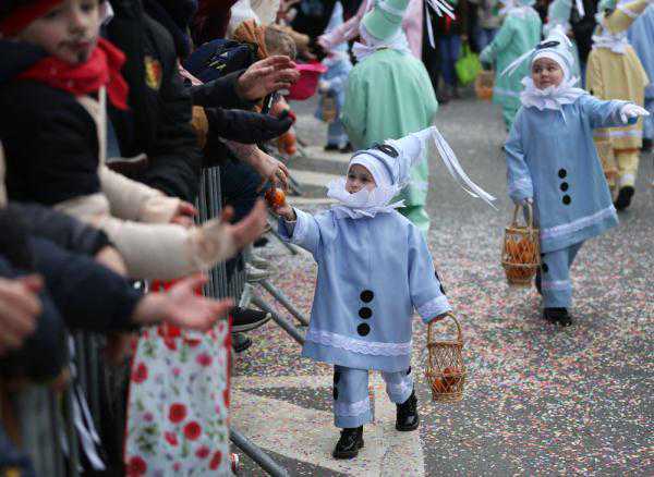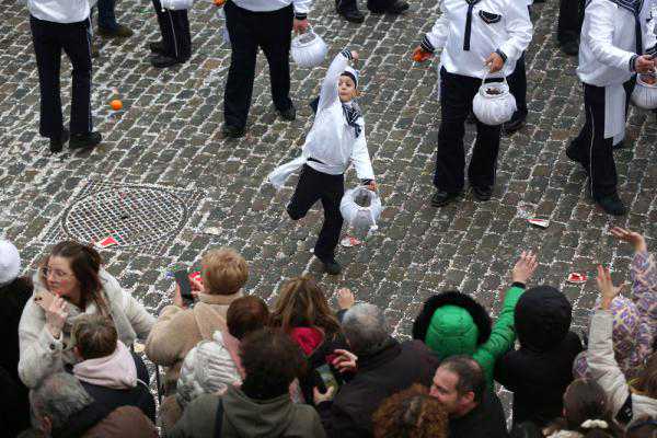↑2月13日,在比利时南部小镇班什,装扮成“水手”形象的小朋友(中)一边游行一边向游客扔血橙。据说,血橙代表祝福,接到或被扔到的人都会交好运。