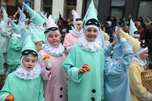 ↑2月13日,在比利时南部小镇班什,装扮成“小丑”形象的小朋友将血橙递给参加班什狂欢节的人们。