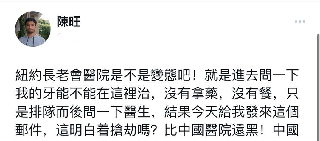 一、润人到纽约医院咨询补牙,现场跟医生对话两分钟,炫耀美国医疗对穷人免费事情的起因是这个陈姓润人到纽约一家医院咨询补牙的事情。