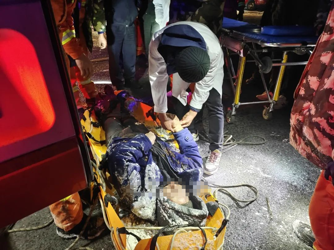 经询问和检查,摔伤人员全身外露肢体多处被划伤,右手右脚骨折,存在失温症状,救援人员立即送上御寒大衣、热水、食物,对被困人员肢体进行固定后用担架转移。