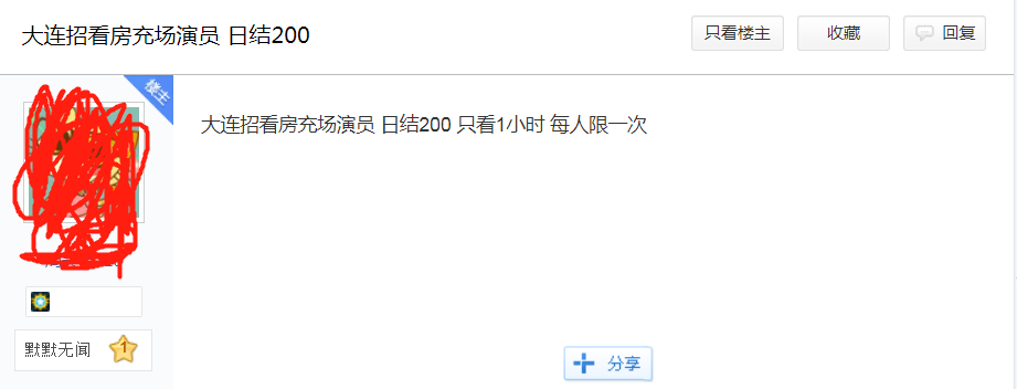 其实最早的看房演员招募出现在网络贴吧里,大连吧就有一则现在依旧存在的招人广告,楼主表示招募看房演员,日结200,只看一小时,每人限一次。