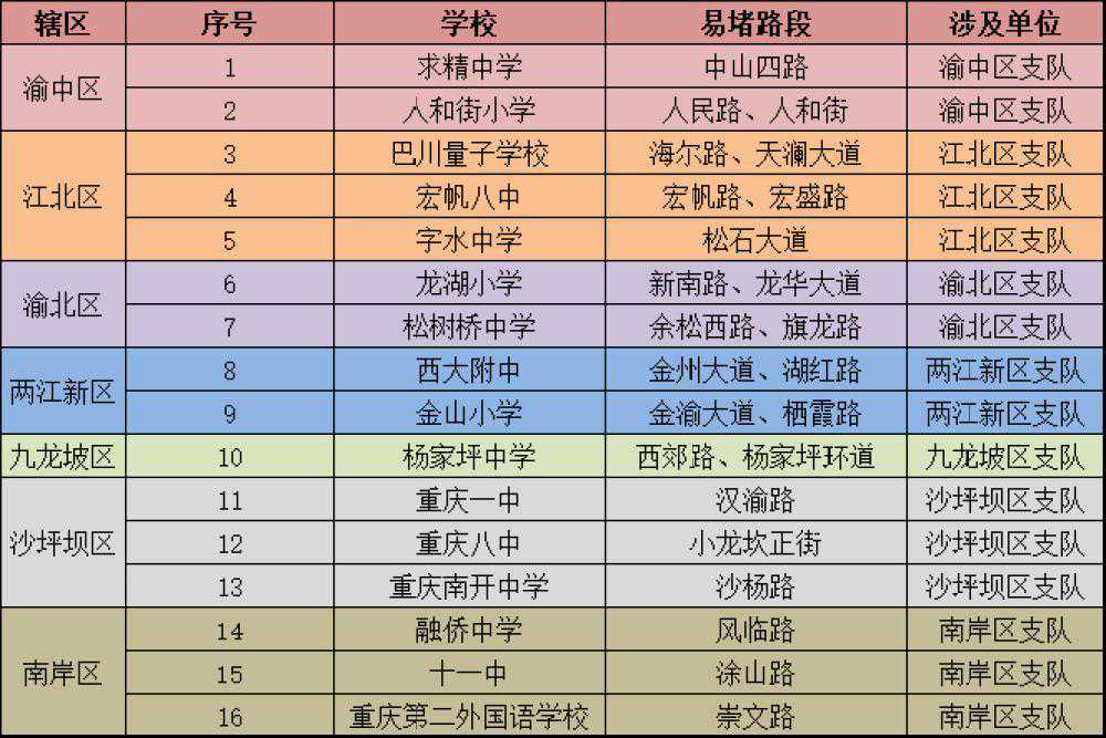 同时,渝中区求精中学周边的中山四路,人和街小学周边的人民路、人和街;江北区巴川量子中学周边的海尔路、天澜大道,宏帆八中周边的宏帆路、宏盛路,字水中学周边的松石大道;渝北区龙湖小学周边的新南路、龙华大道,松树桥中学周边的余松西路、旗龙路;两江新区西大附中周边的金州大道、湖红路,金山小学周边的金渝大道、栖霞路等学校周边道路也将出现时段性拥堵,学校及周边易堵道路详见表格:
