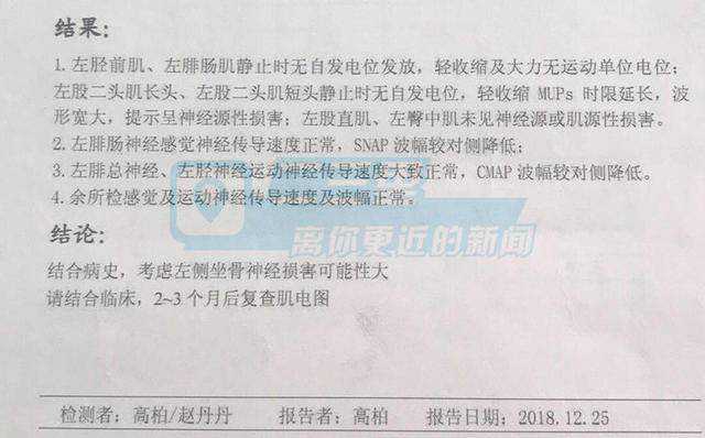 昨日,二三里资讯见到了刘女士,她说:“生完宝宝后,过了24小时麻药劲就应该过了,大夫过来拔尿管,让我下床活动走路,然后我发现我左腿膝盖以下就不会动了,走不了,得让人扶着才能走,后来就坐轮椅,我就问了大夫,大夫给我的回复是可能麻药打多了,过两天就能好。后来我也没当回事就一直在医院养着,正常我是住5天就可以出院,但是第五天的时候医生怕腿出问题,就找了盛京医院的一个骨科专家过来给我会诊,看了一会,说我这腿是神经受损,正常是三到六个月能恢复,然后安联医院就给我开的甲钴胺、维生素B1等药品,按照神经受损给我开的,然后还打了7天吊瓶,这7天我们家属就不同意了,然后安联又领我去了医大四院拍的核磁共振,显示没有问题,后来又做的腿部肌电图,结果显示坐骨神经受损,就按照这个病给我治,安联带我去医院都没排队都是找的人,因为他们都认识。又给我找的医大二的专家会诊,让我打点激素说好的快,我哺乳期是打不了的。”
