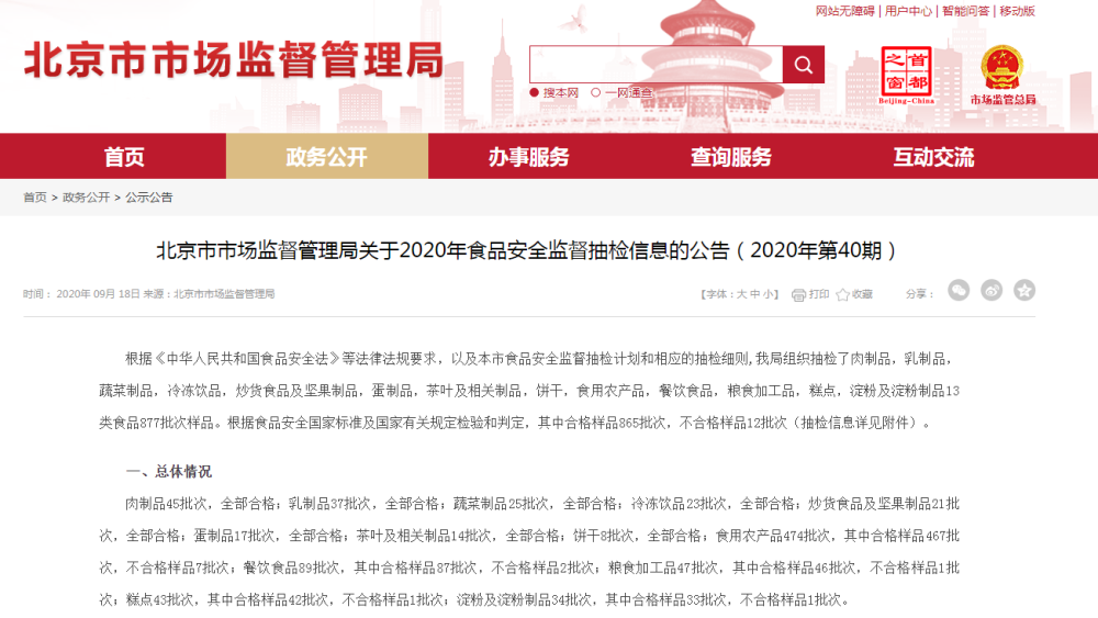 近日,北京市市场监督管理局发布《北京市市场监督管理局关于2020年食品安全监督抽检信息的公告(2020年第40期)》,抽检出12批次食品不合格,具体公告如下: