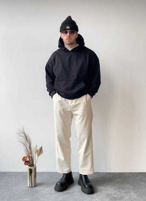 ②叠搭卫衣+黑色西裤