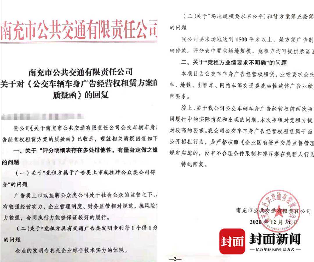 封面新闻记者苏定伟1月8日,四川南充公布了公交车辆车身广告位经营权租赁综合评审结果,公布中标公司。然而这一结果却引发质疑,公交公司卖车身广告,按常理应该价高中标,这次为什么价高却没有中标呢?南充公交公......