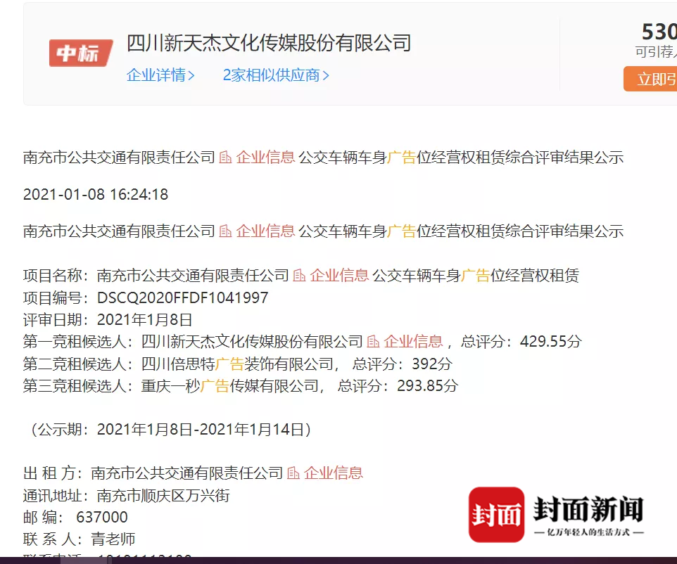 1月8日,南充市公共交通有限责任公司(以下简称南充公交公司)公布了公交车辆车身广告位经营权租赁综合评审结果。经过近半月的激烈竞标,该租赁权最终由四川新天杰文化传媒股份有限公司(以下简称四川新天杰公司)年租金580万元斩获,合约期五年。