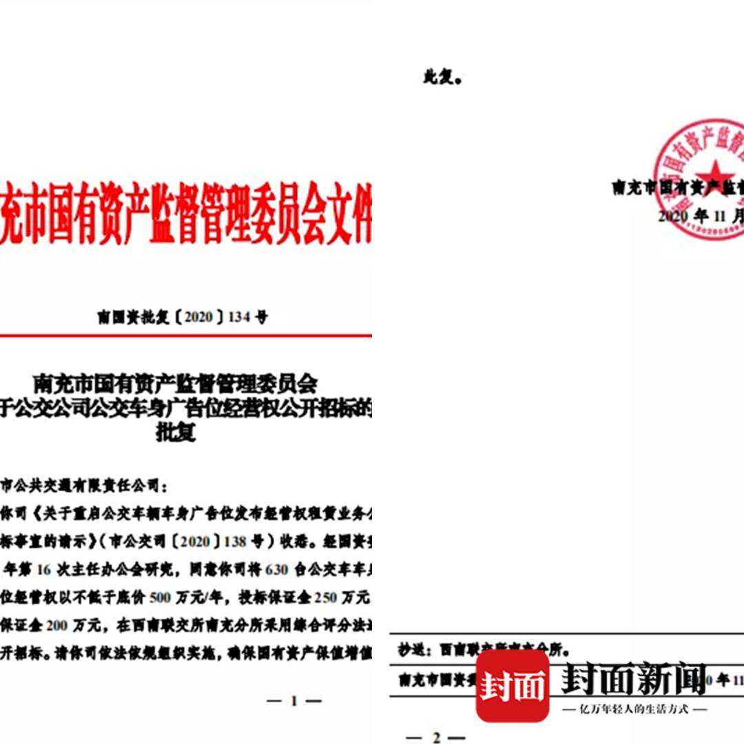 据了解,早在公交车身租赁信息发布前的2020年4月和2020年10月,“新天杰”先后向南充公交公司以500万/年租金的方式提交过两次“过渡性方案”以求合作,南充公交公司(文号[2020]130号)也向主管部门南充市国资委提交了过渡性方案的请示,但都被南充市国资委在综合考量后否决。为了让国有资产保值增值,2020年12月17日,南充市国资委批准了南充公交公司的车身广告租赁方案请示。