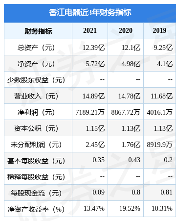 从目前公布的财报来看,香江电器2021年总资产为12.39亿元,净资产为5.72亿元;近3年净利润分别为7189.21万元(2021年),8867.72万元(2020年),4016.1万元(2019年)。详情见下表: