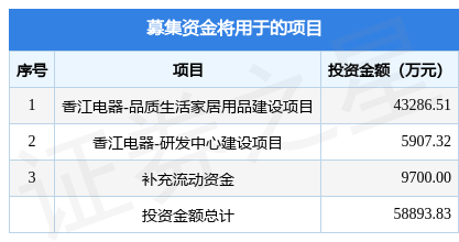 湖北香江电器股份有限公司(简称:香江电器)拟在深交所主板上市,募资总金额为5.76亿元,保荐机构为国金证券股份有限公司。募集资金拟用于香江电器-品质生活家居用品建设项目、香江电器-研发中心建设项目、补充流动资金,详见下表: