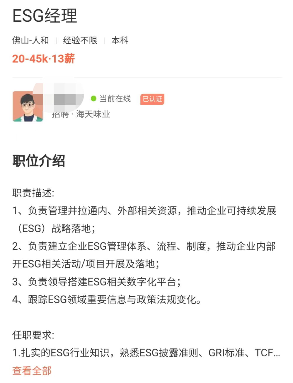 2023年春,ESG业界流传着一则招聘信息:海天味业要招聘一位“ESG经理”,月薪最高能给到4.5万。
