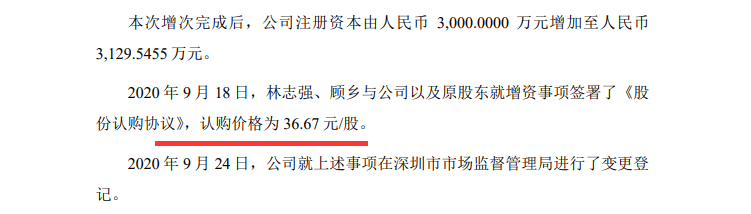 第三次增资,2020年9月增资。林志强、顾乡分别出资2,750.0000万元认购75.0000万股,顾乡以货币方式出资2,000.0000万元认购54.5455万股,现有股东放弃优先认购权。认购价格为36.67元/股。