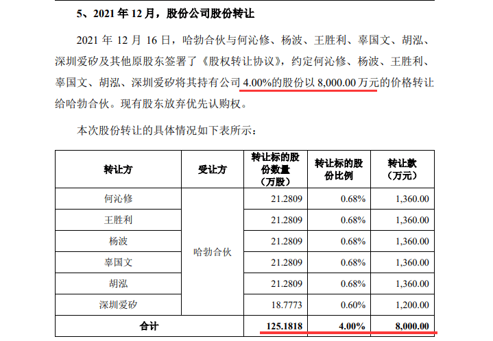 第二次股权转让:2021年12月,股份公司股份转让(注:2019年12月,整体变更为股份有限公司)。哈勃合伙与何沁修、杨波、王胜利、辜国文、胡泓、深圳爱矽及其他原股东签署了《股权转让协议》,约定何沁修、杨波、王胜利、辜国文、胡泓、深圳爱矽将其持有公司4.00%的股份(即125.1818万股)以8,000.00万元的价格转让给哈勃合伙。按照8,000.00万元除以125.1818万股,即每股约63.91元。