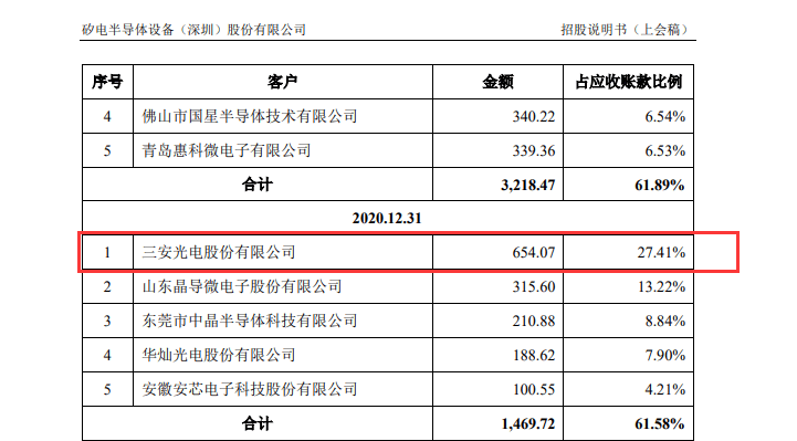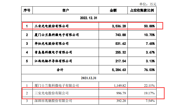 2020年度-2022年度,三安光电、江西兆驰半导体有限公司均为矽电股份的前五大客户之一(注:2021年度,江西兆驰半导体有限公司未进入前五名客户名单)。并且,需要注意的是,期间,三安光电均作为第一大客户,为矽电股份贡献大份额业绩,其中2022年度更是贡献了过半营收。