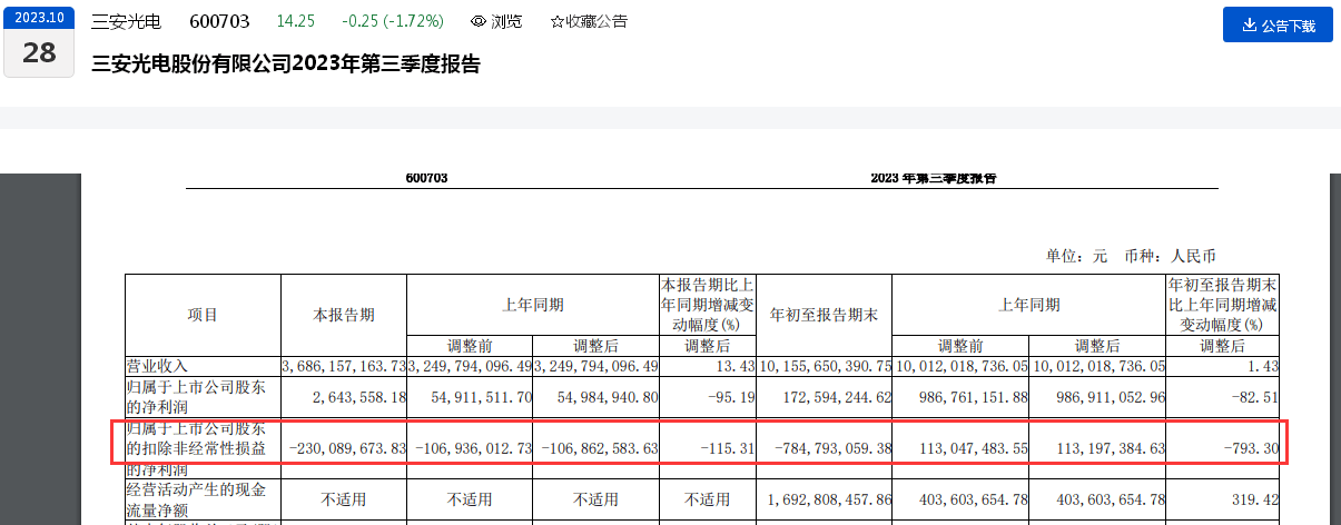 需要指出的是,三安光电今年前三季度出现了亏损,即前三季度,归母扣非净利润录得:-7.85亿元,同比下滑793.30%。