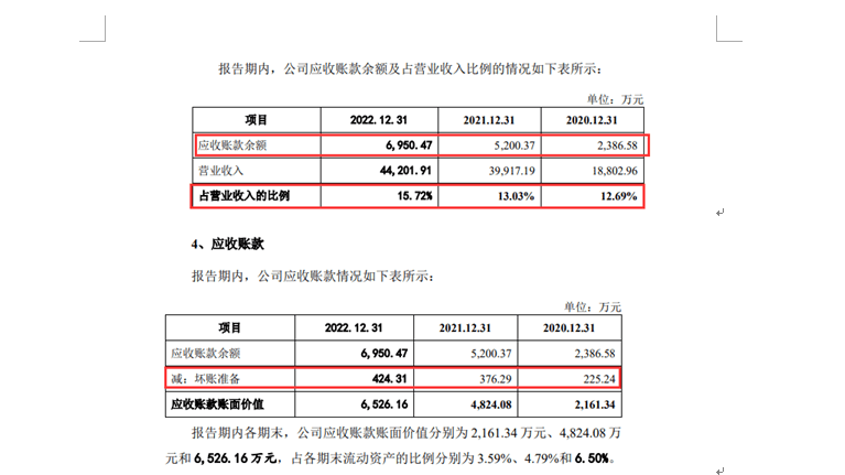 不过,需要注意的是,在上述两名关联人入股后,三安光电、江西兆驰半导体有限公司营收贡献大增的同时,矽电股份的应收账款也在增长。2020年-2022年末,矽电股份的应收账款余额分别为:2,386.58万元、5,200.37万元、6,950.47万元,占当期营收比例分别为:12.69%、13.03%、15.72%。