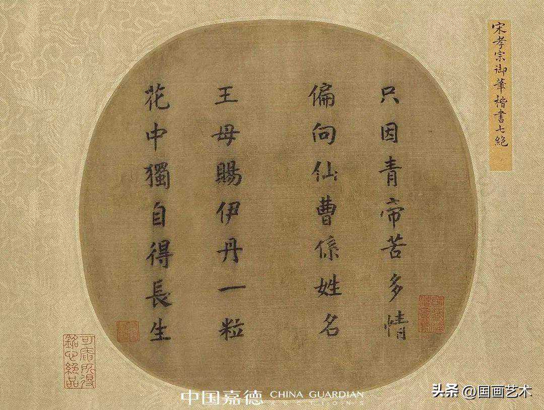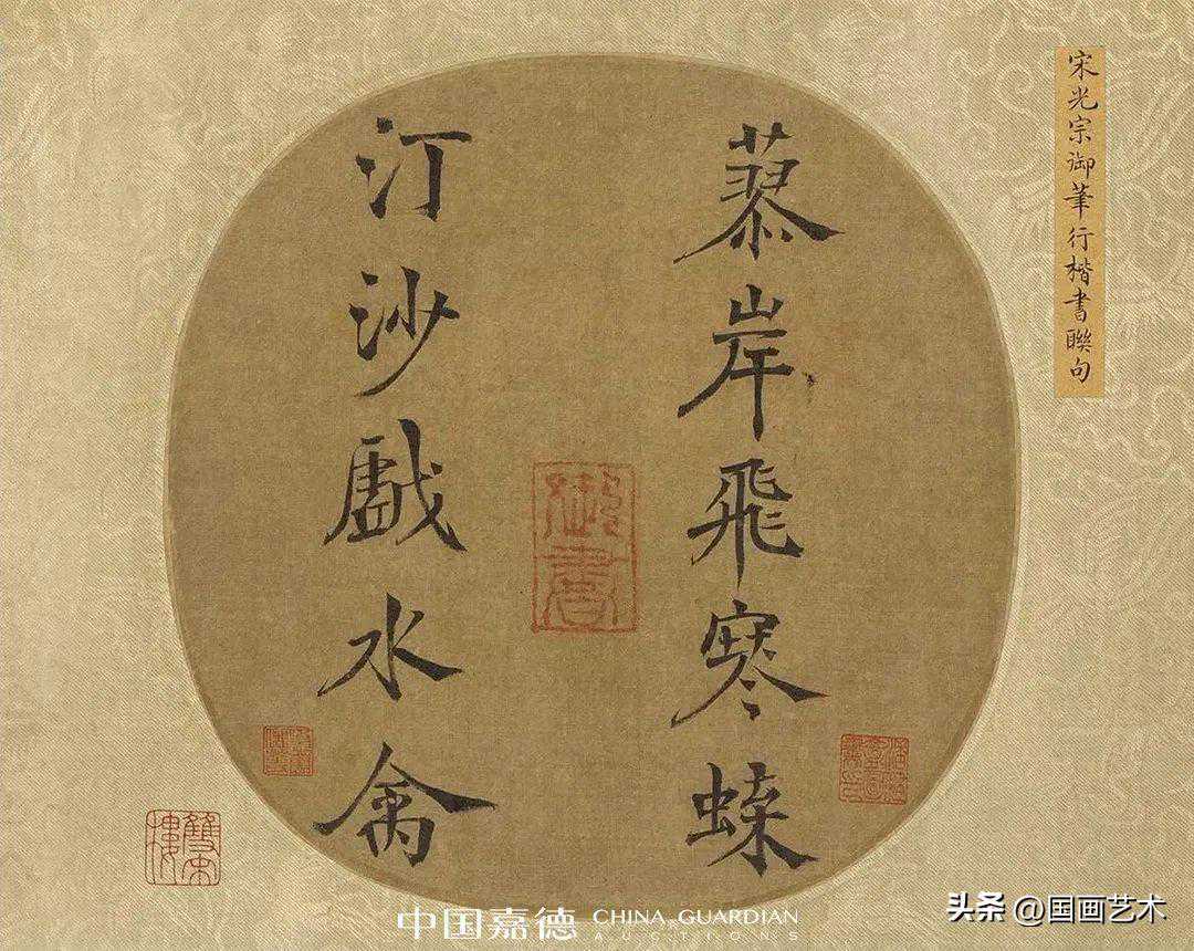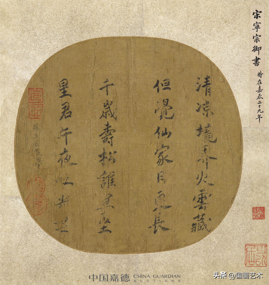 《楷书清凉境界七绝》纨扇页,前人定为宁宗,实为杨妹子。其书写起笔带尖,流畅的连字,华丽的捺笔,确与宁宗相类,可见史传杨妹子可为宁宗皇帝代笔所言不虚。现今约有十余件墨宝传世,主要藏于海内外等公立机构。