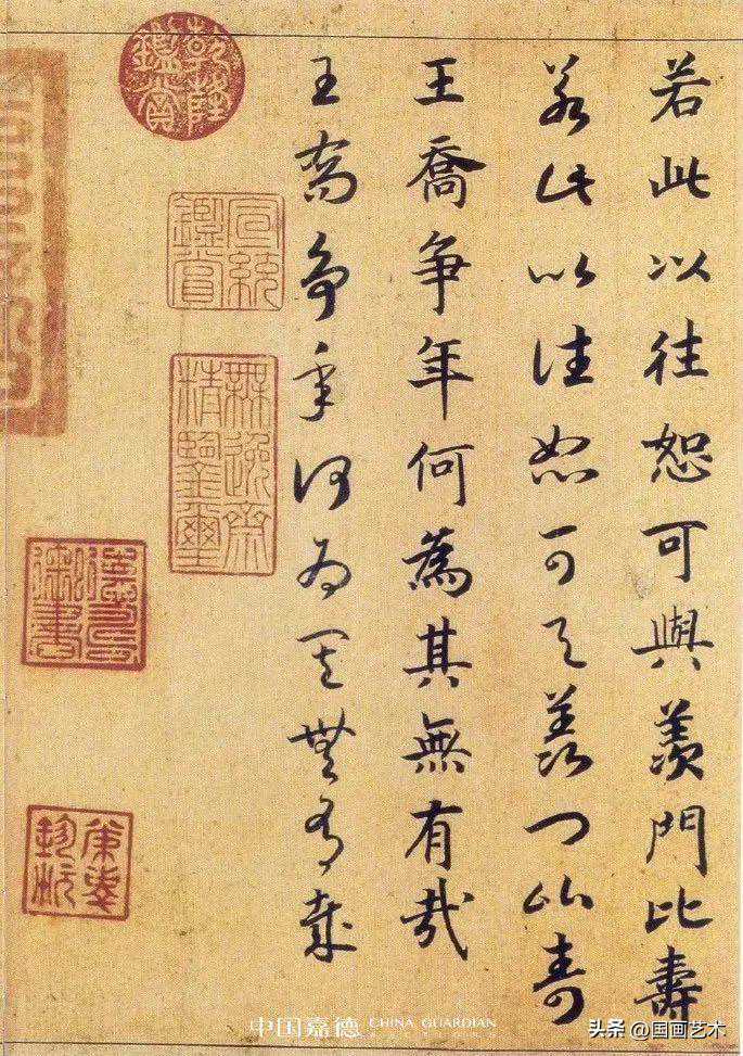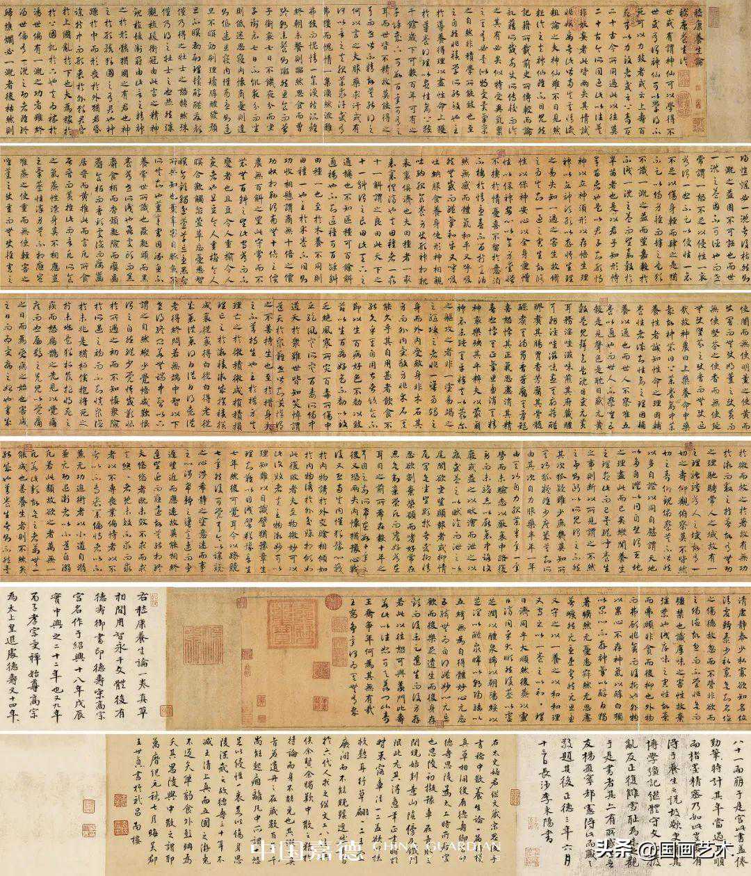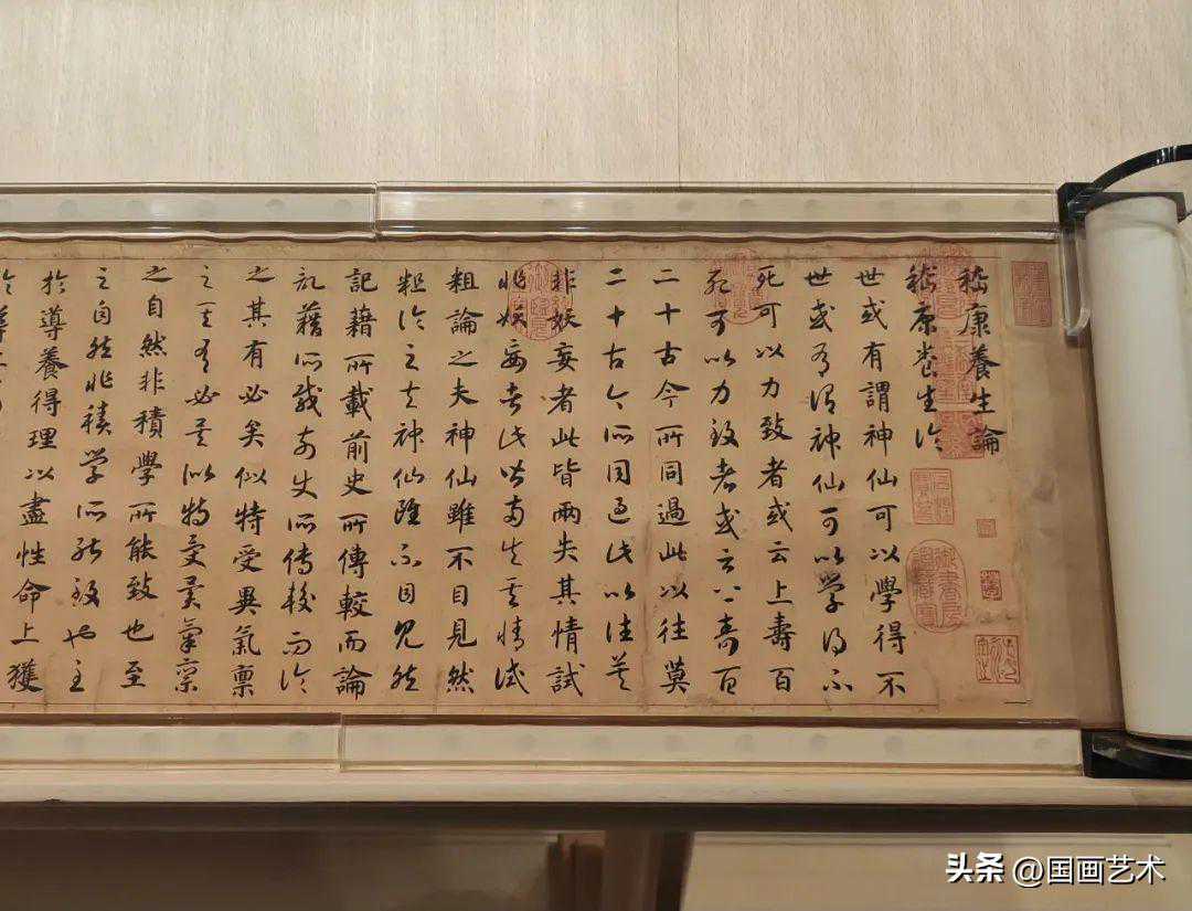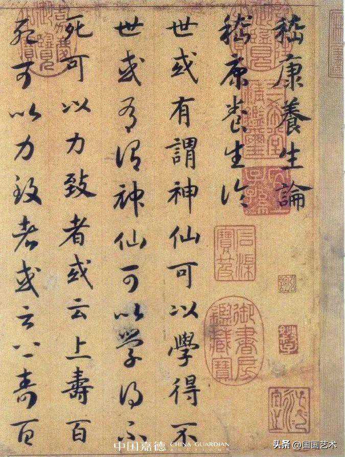 《嵇康养生论》卷,正文总计2472字,以真草二体书于宋藏经笺纸上,袭隋智永《真草千文》风格,篇末钤“德寿御书”印,可知为赵构逊位称太上皇时所书。此卷钤有元代印“天历之宝”,从宋内府到元内府,应一直珍藏于宫中。据史载,至明弘治、嘉靖年间,因宫中银两匮乏,皇帝尝以古玩字画抵充俸禄赐予王公大臣,故推此卷应于此时流出宫外。另从李东阳后跋而知,此卷曾归杨一清所有。清初归大藏家梁清标,后入藏清宫,著录于《石渠宝笈•初编》。溥仪在位时,又以赏弟溥杰为名,偷携出宫。后散落民间。如今,这卷传世名迹是上海博物馆的重要藏品之一。