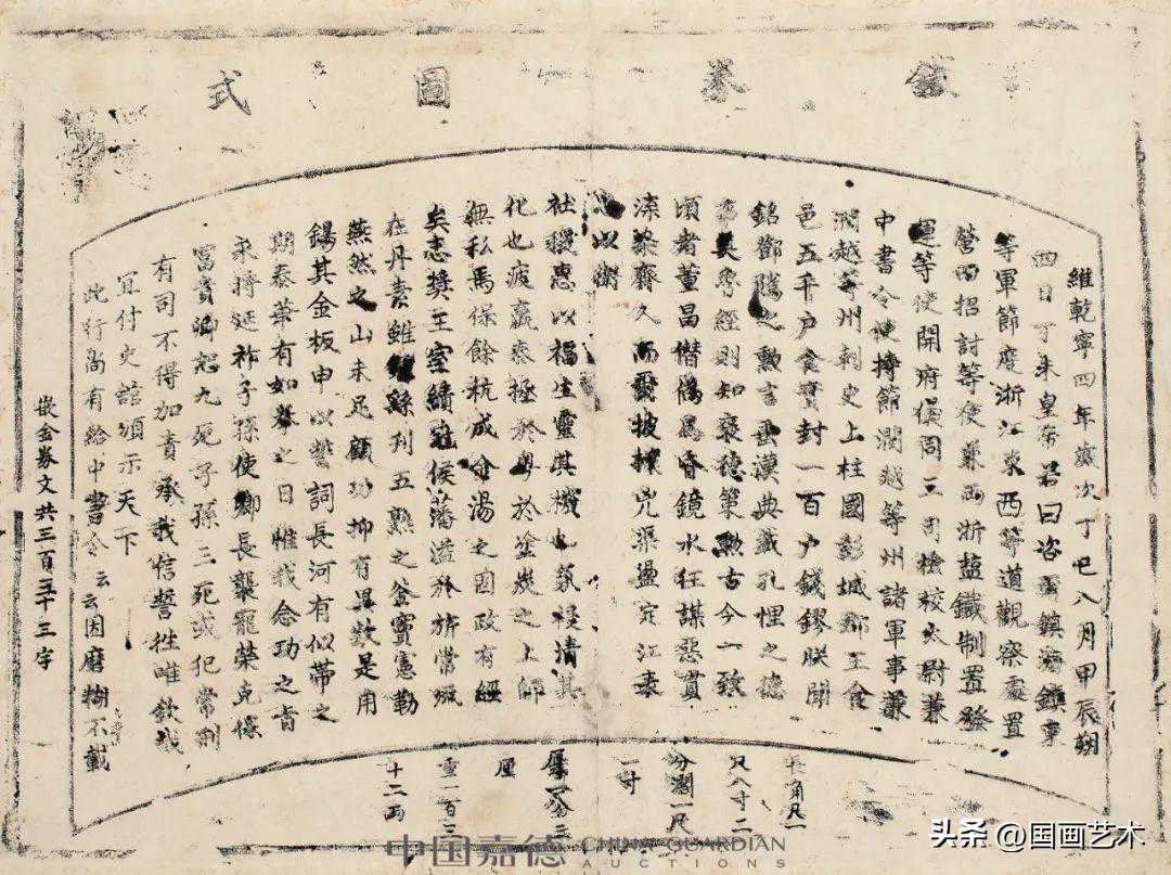 本卷与浙江省博物馆一级藏品五代吴越王钱镠、钱俶《批牍合卷》原系一卷,史称“二王手泽”。内含四个部分:唐昭宗赐吴越国首王钱镠“金书铁券”明代木刻拓本;吴越国末王钱俶《草书手简》;南宋朱熹《六月五日帖》;宋、元、明、清、民国49人题跋和观款。是市场上极其罕见的千年翰墨瑰宝。