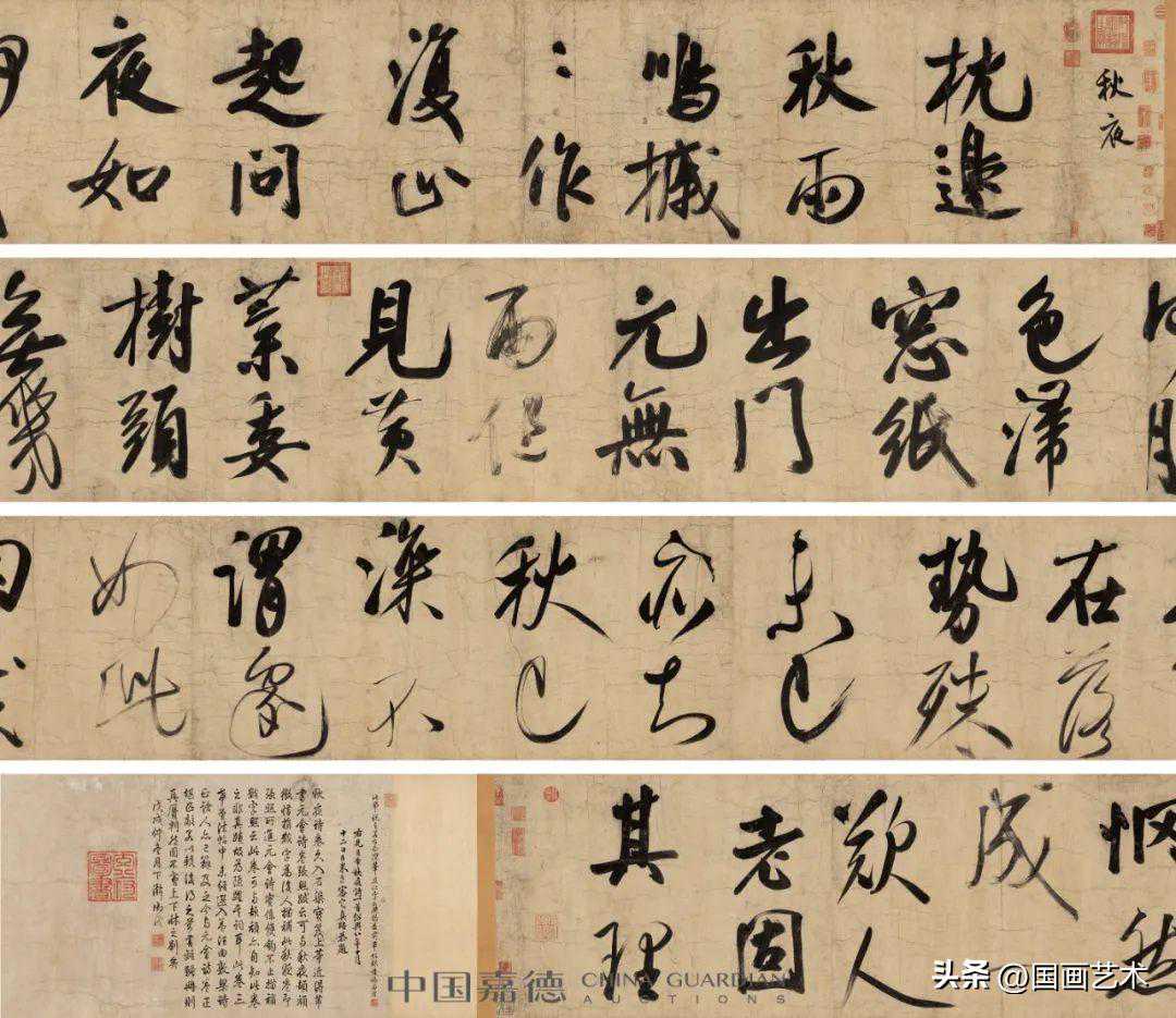 元代书法多瓣香赵孟頫,而宋克能自立门户。此卷全长逾六米,书法体势开张,在行草书中夹杂着一些章草书的结构、笔法。诚如张珩所题“如公孙大娘舞剑器,浏漓浑脱,无迹可寻,与杜诗堪为双绝。”