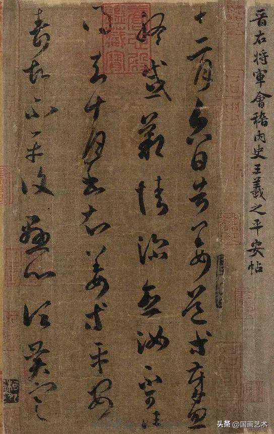 王羲之手书墨迹真本,世早失传。现存者除刻帖外,墨迹多为唐摹本或古临本。此《草书平安帖》又称《告姜道帖》,历代鉴藏家多认定为唐人或宋人摹本。当时共有九行,后被一分为二,此为前半部。绢地极古,墨色浓黑,笔法圆劲古雅、意致优闲逸裕,颇合羲之草书法度。