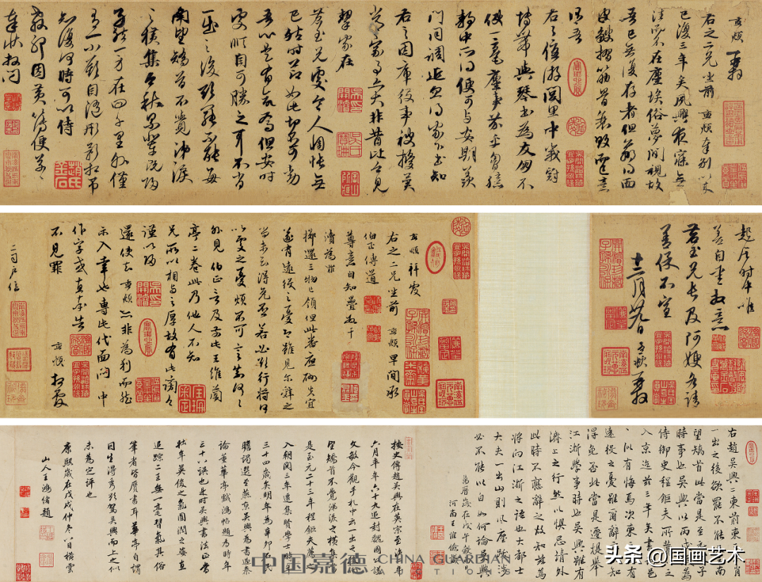 明中期为汪道昆所得,首尾皆钤有其藏印。清初为周亮工藏,清乾、嘉时入阮元之手,骑缝皆钤其“雷塘庵主”小印。近代归之袁励准,复归张葱玉。张氏获此卷后,极为爱重,有四段书跋,并于上海昌艺社珂罗版影印。