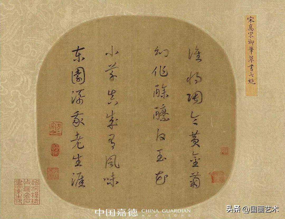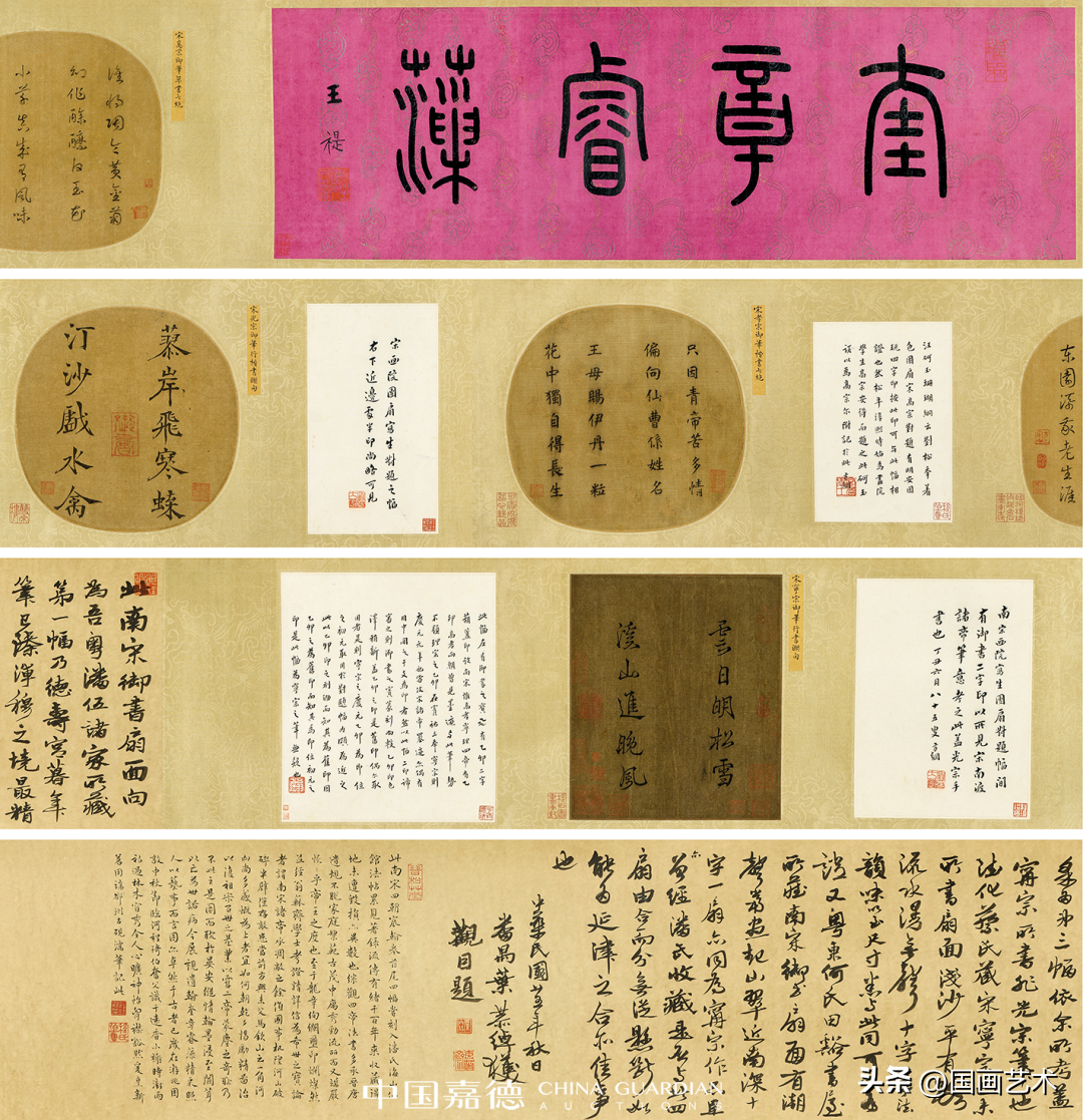 《南宋四朝宸翰集锦卷》集南宋早中期数帝所书团扇、斗方四幅:一题为宋高宗《草书黄庭坚〈戏答王观复酴醾菊〉》,明中期无锡安国所藏之物;二题为宋孝宗《楷书七绝》;三题为宋光宗《行楷书联句》;四题为宋宁宗《行书联句》,曾经耿昭忠、耿嘉祚父子鉴藏。每幅均有翁方纲对题,考证精详。卷首王禔题:“奎章睿藻”。卷尾叶恭绰、程琦题跋。潘延龄、程琦递藏,尝刻入潘氏《海山仙馆法帖》,累见著录,流传有绪。