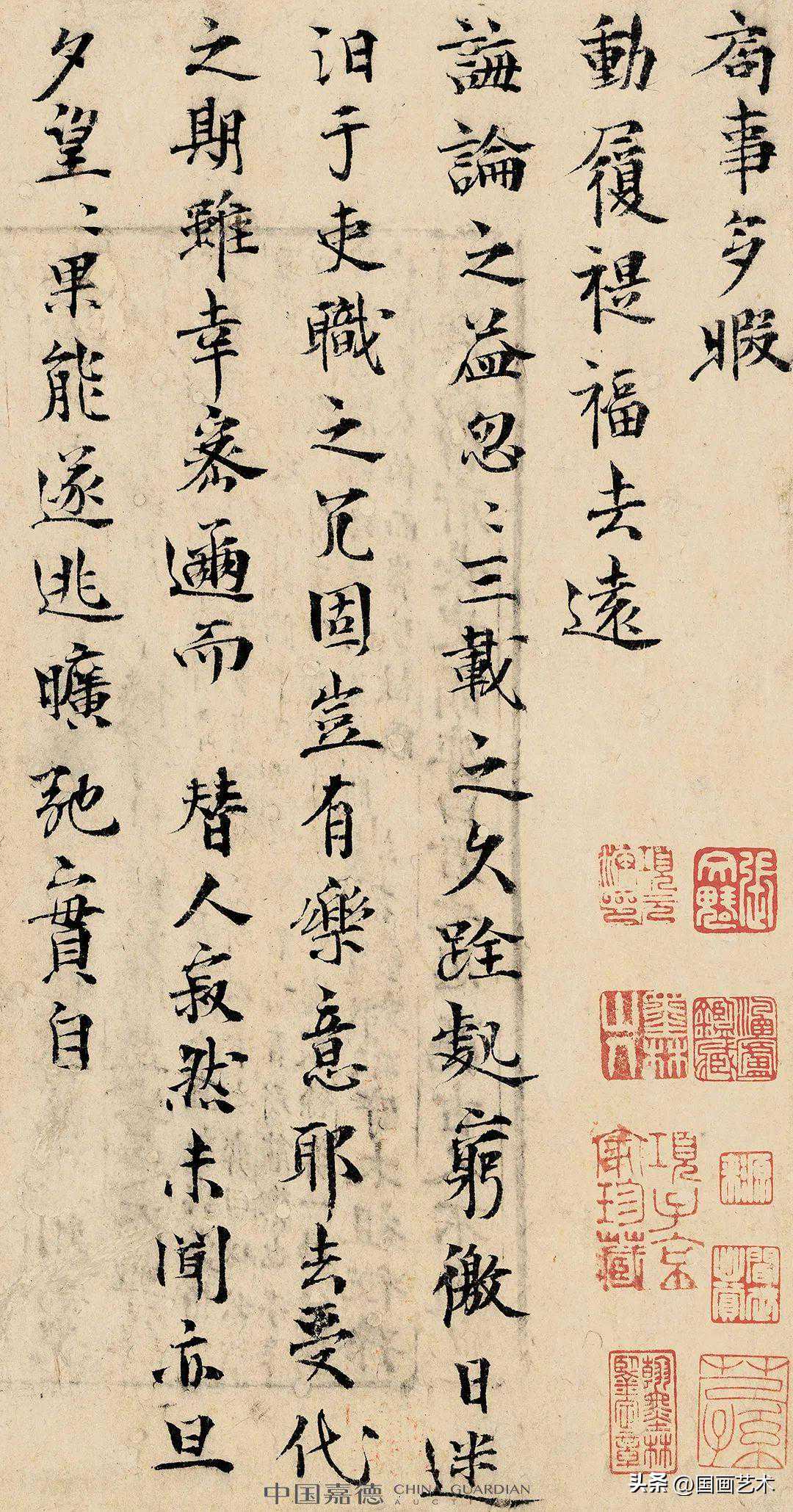《海赋》作于大德七年(1303),时年赵孟頫50岁。册中钤有清乾隆和嘉庆两朝御览之宝,后有“四朝文臣”祁隽藻、清末收藏家狄学耕题跋。从中而知,此册曾入内府,有西清鉴藏旧式题签。赞其:“笔力圆劲,意趣洒然,自是松雪真迹,赐本流传,良可珍贵。”