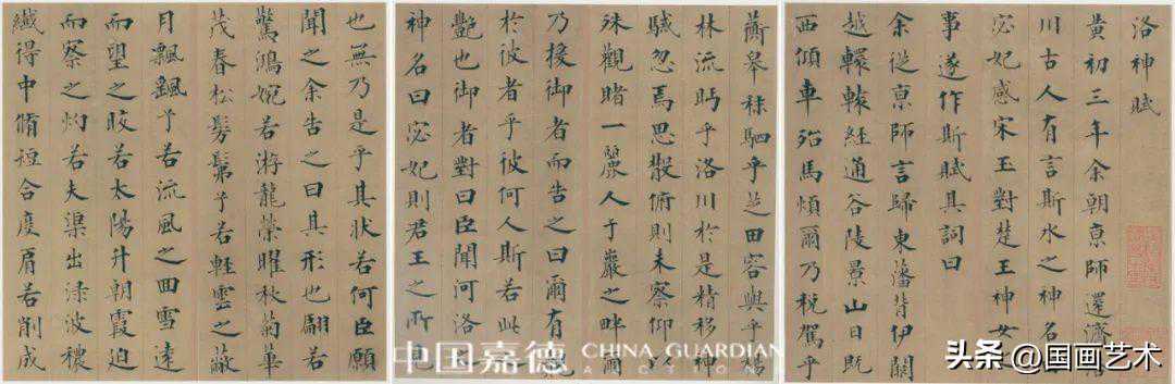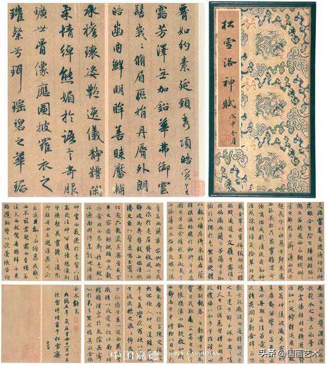 《洛神赋》书于大德五年(1301)赵孟頫四十八岁时,其时赵氏正在江浙等处儒学提举任上,故自署书于松雪斋。结体宽博俊美,笔法圆转纯熟,洋洋洒洒一气呵成而意态安详。