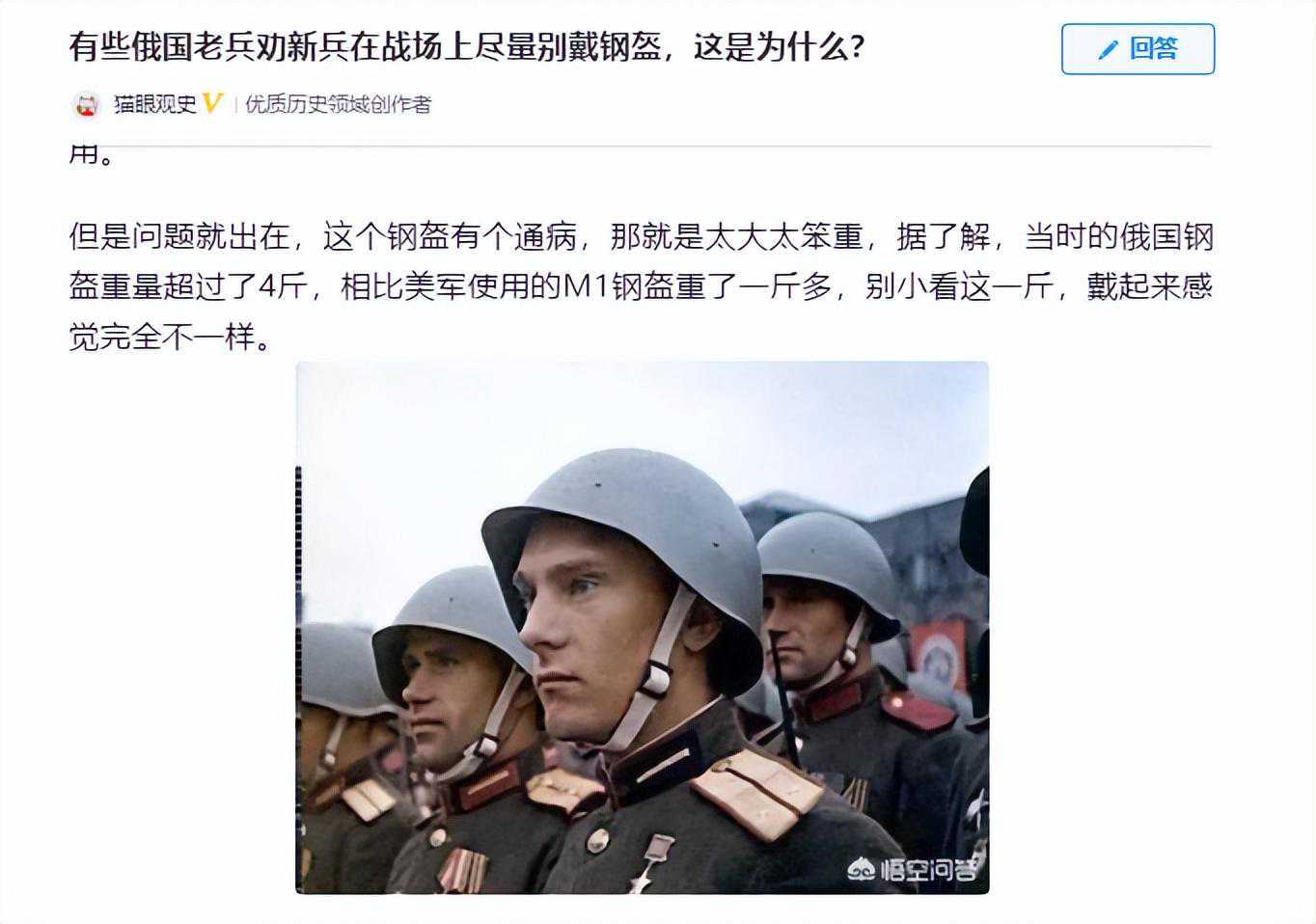 先看苏联士兵不戴钢盔这个问题,大体上就是下面几类,“苏联士兵戴钢盔之后伤亡率更高”、“二战苏联老兵劝新兵不戴钢盔”.至于原因就是:苏联钢盔太重、戴上之后影响灵活性、消耗体力,所以变成催命符了。